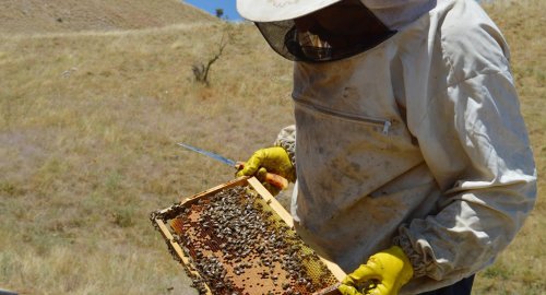 Büyükşehir Belediyesi’nden aldığı 5 arılı kovanla birlikte toplam 25 tane arılı kovanı olduğunu belirten Yılmaz, bu sene kurak geçmesine rağmen 100 kiloya yakın bal hasat ettiklerini söylüyor.